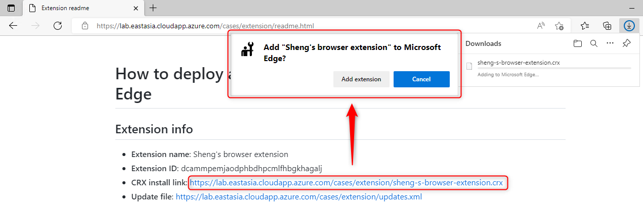 After these settings are applied, user can visit the extension installation page: https://edge.eastasia.cloudapp.azure.com/cases/extension/readme.html and click the CRX file link to install the extension.