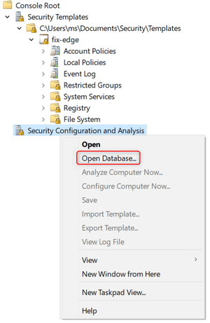 Save the file. Add another Snap-in in MMC: Security Configuration and Analysis. Right click it and choose Open Database.