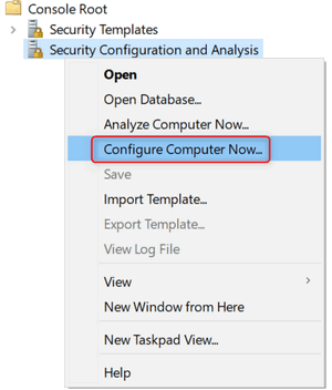 Right click Security Configuration and Analysis again, choose Configure Computer Now...