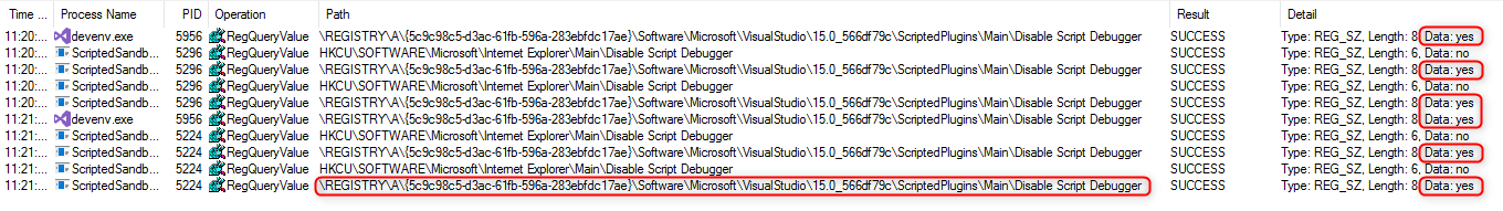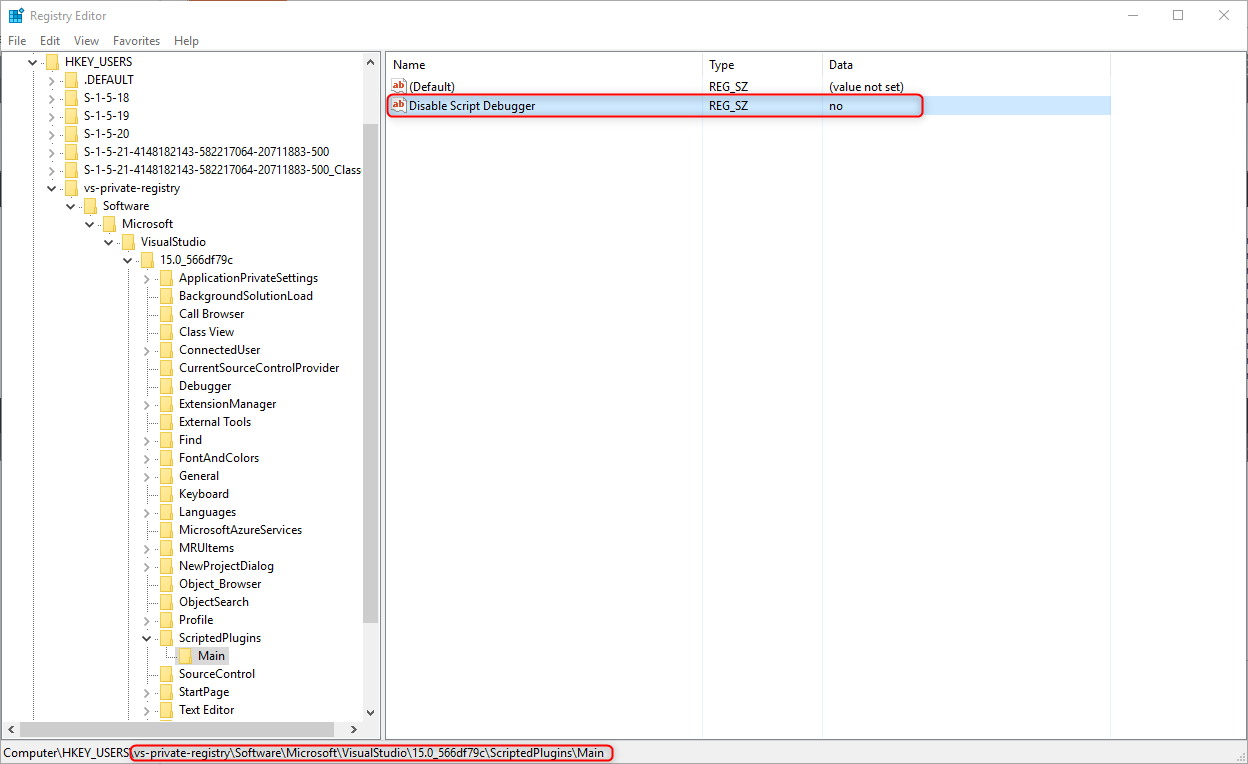 {vs_private_registry}\Software\Microsoft\VisualStudio\{vs_version}\ScriptedPlugins\Main, thevs_private_registryshould be the name you specified in step 4 and thevs_versionshould be the same folder name as you found in step 3. Then change the value ofDisable Script Debuggerto no.