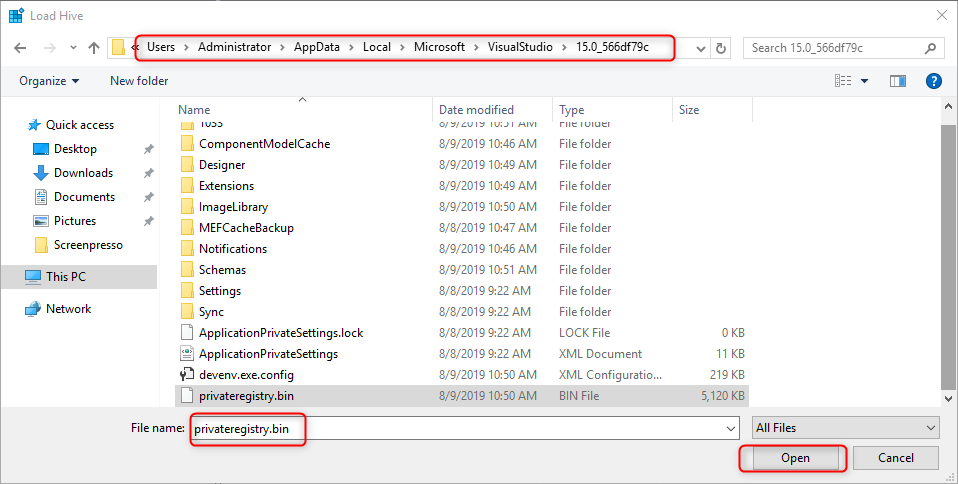 %userprofile%\AppData\Local\Microsoft\VisualStudio, you will see one folder indicating the Visual Studio version,15.0_566df79cin my case. Go inside this folder, choose privateregistry.bin.