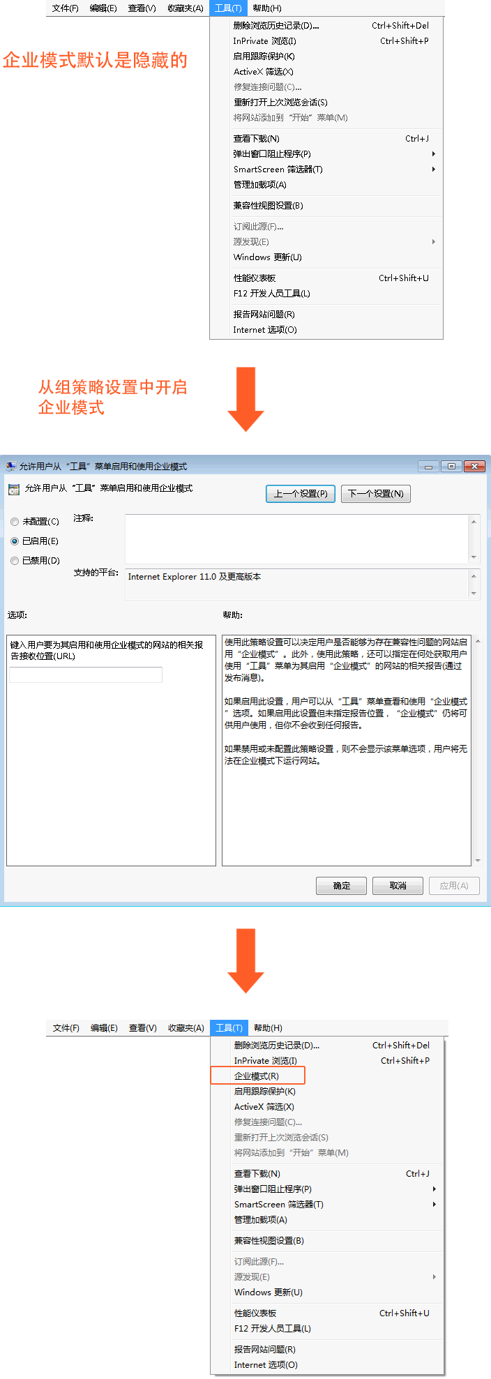 用户在访问某个网站时可以手动从工具菜单中启用企业模式。默认情况下,企业模式这个选项是隐藏的,只有管理员启用下面的组策略设置后才能显示。