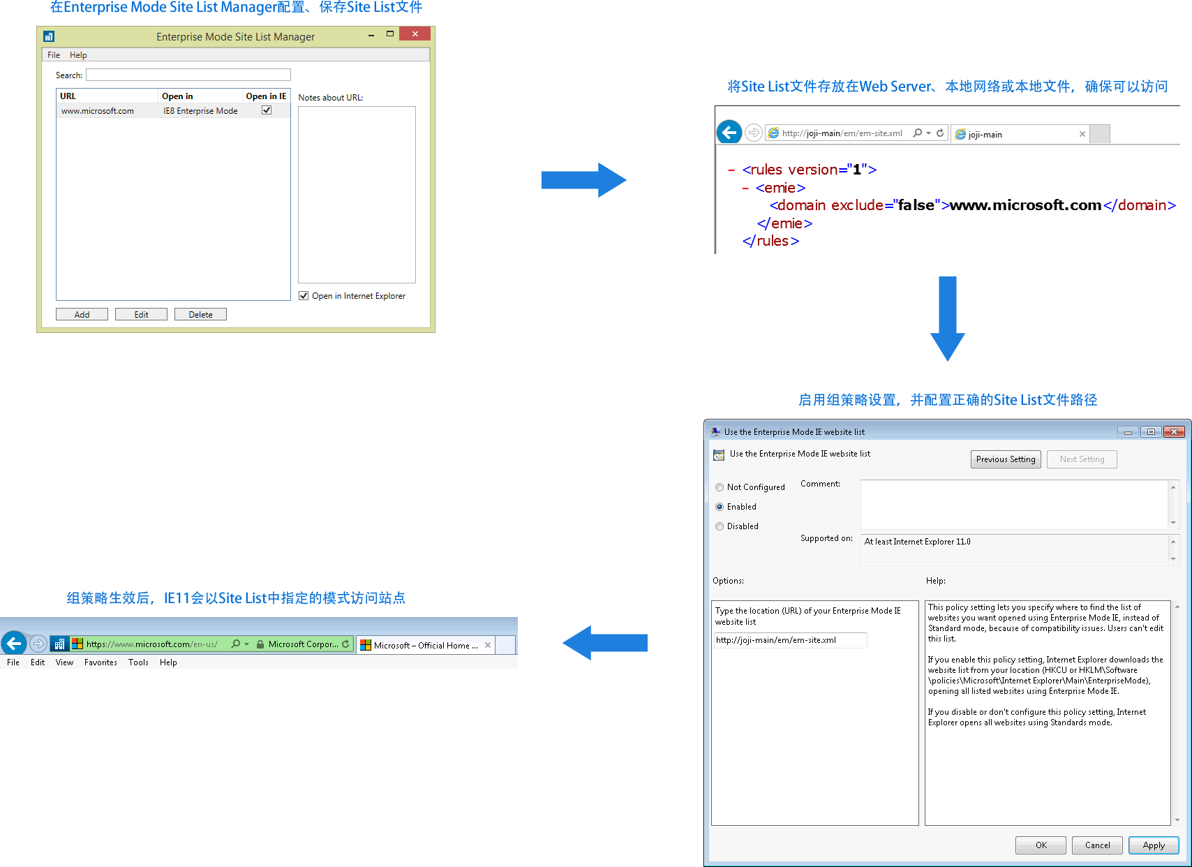 IE 会记住用户手动启用了企业模式的站点,并在下次访问该站点时直接使用企业模式,但是这仅针对该用户生效。IT 管理员可以使用站点列表来统一管理每个站点使用什么样的浏览模式,然后通过组策略分发给所有用户。