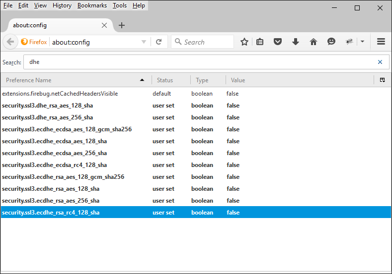 Launch Firefox, navigate to "about:config" from address bar, search "dhe", double click all the Diffie-Hellman ciphers to change the Value to false, restart Firefox to take effect.